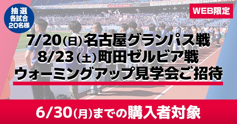 6/30(月)までにご入会の方から抽選で40名様(各試合20名様)を、 7/20(日)名古屋グランパス戦、および8/23(土)FC町田ゼルビア戦のウォーミングアップ見学にご招待いたします。