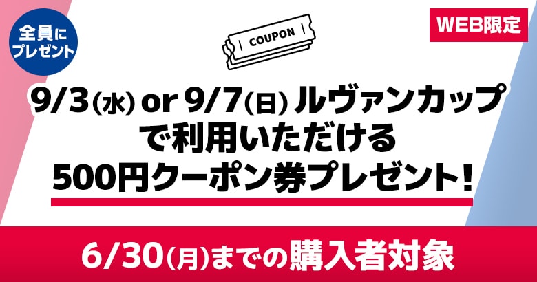 6/30(月)までにご入会(決済済)の方を対象にもれなく、9/3(水)or9/7(日)に開催されるルヴァンカップ準々決勝のホームゲームチケット購入時にご利用いただける500円クーポンをプレゼントいたします。
