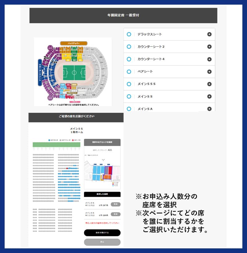 お気に入りの席がある方、試合ごとに座席選択が面倒という方におすすめ。